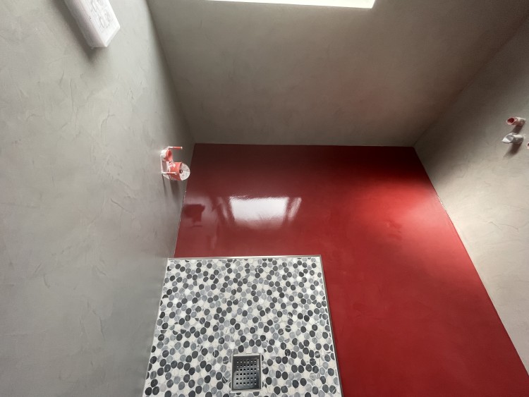 Da haben wir wieder etwas echt hübsches gezaubert. Ein fugenloses Bad mit Wandflächen in einer hochwertigen Betonoptik und einem roten hochglänzenden Fußboden.