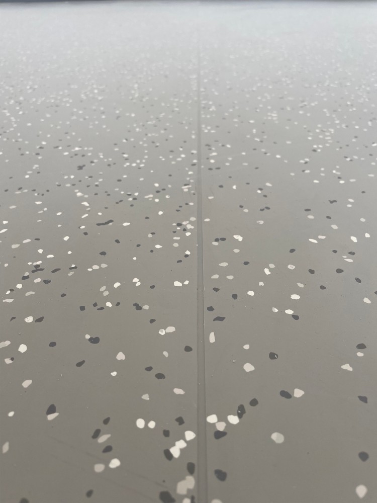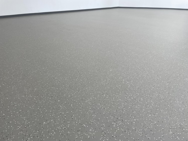 Nun hat er in einem großen Raum einen hoch belastbaren und sehr widerstandsfähigen Kautschuk-Bodenbelag äußerst akkurat verlegt! Zuvor hat er den Unterboden sauber geschliffen, grundiert und mit einer Bodernausgleichsmasse vollflächig gespachtelt.